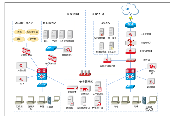 隨著醫院信息化應用不斷普及,醫療衛生體制改革的不斷深化,醫院為了提升競爭力、方便患者就醫,逐步與銀行、社保、新農保等單位互聯互通,并開展移動醫療、遠程醫療等互聯網醫療應用。醫院信息化在快速發展的同時,也面臨更多的信息安全威脅,如醫患數據信息泄露、互聯網黑客攻擊、內部人員越權違規等。一旦網絡癱瘓或醫院經營和患者私密信息的泄露,將會給醫院、社會和患者帶來極大的安全風險和不良影響。